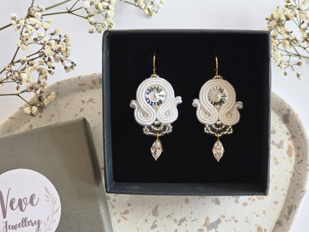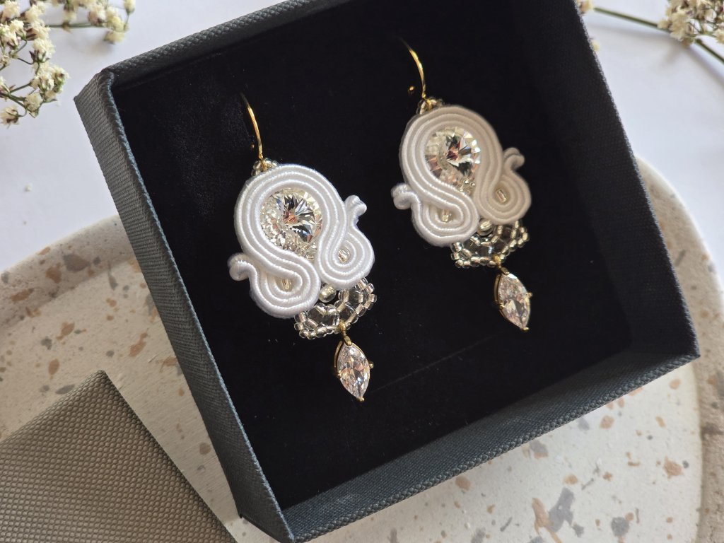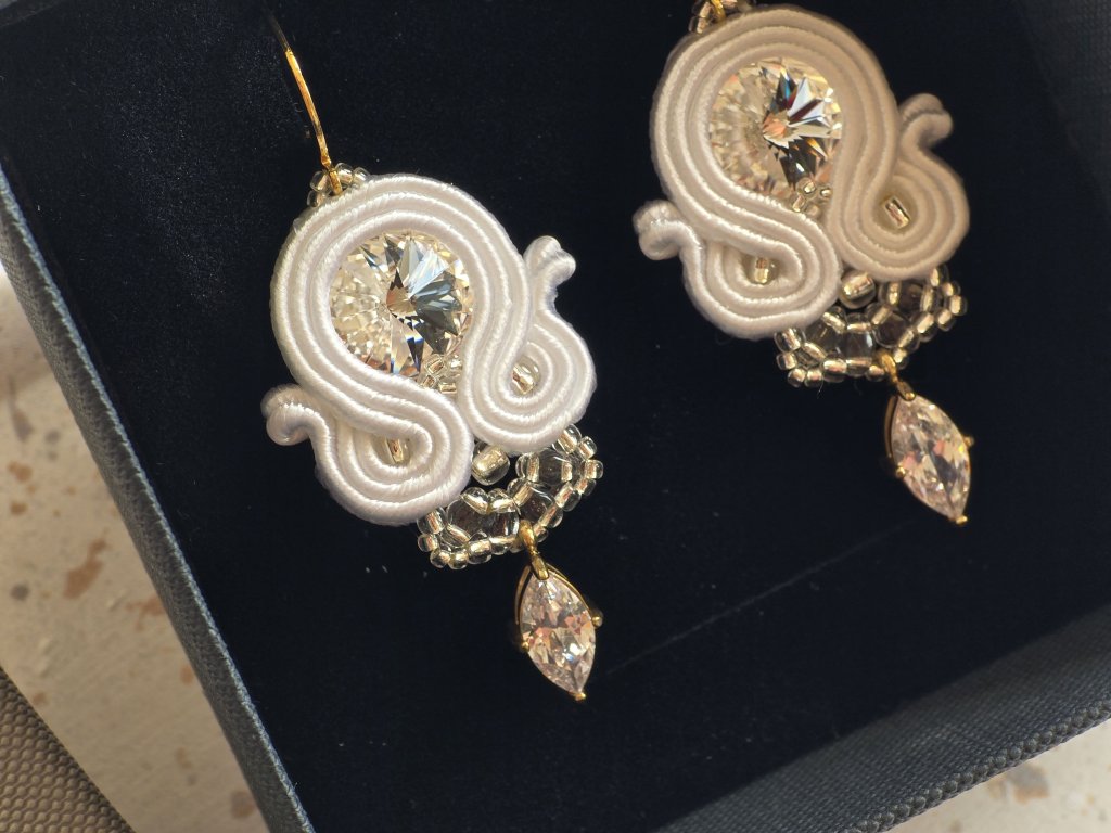materiál: Swarovski krištále, japonský rokajl, soutache nite, zirkónový prívesok, chirurgická oceľ